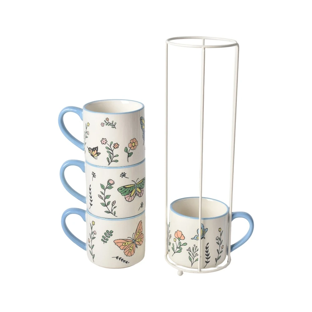 Welcome to purchase our 400 ml wholesale printed mugs featuring a 4-piece stackable design, ideal for retailers, gift suppliers, and hospitality buyers. These stackable ceramic coffee mugs are made of stoneware and can be customized with brand logos, patterns, colors and packaging. These ceramic cups are advantageous for hotel chains, coffee shops, corporate gifts, and retail brands.