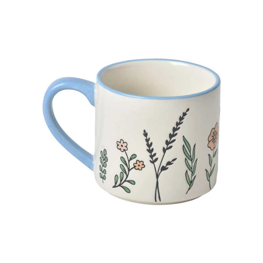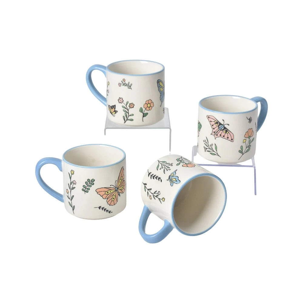 • Aesthetic Dual-Color Contrast Design: These wholesale printed mugs feature a creative combination of a pristine white ceramic body with intricate butterfly embossing, complemented by vibrant hand-painted blue rims and handles. This bold, dual-color contrast creates a cohesive, high-impact series that stands out on retail shelves and enhances modern interior aesthetics.