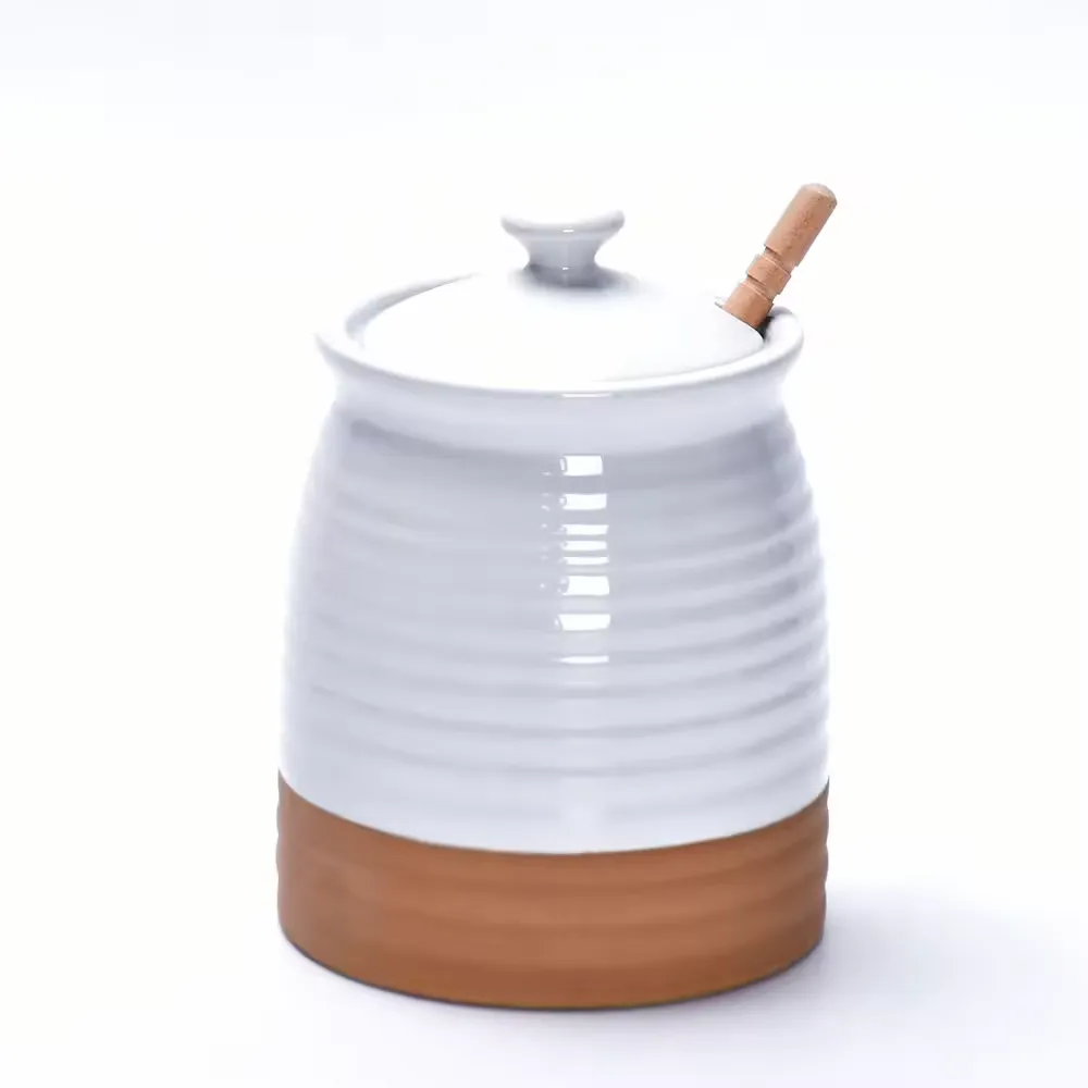 Welcome to purchase our ceramic honey pot wholesale with lids and a dedicated wooden stirrer. Made of high-quality and durable ceramic, smooth and easy to clean. The bulk food storage jars are made from high-fired food-grade ceramic for safe and long-lasting use. Suitable for food brands, boutique supermarkets, hotels, and gift merchants. Available in bulk with OEM/ODM customisation for logo, colour, and packaging.